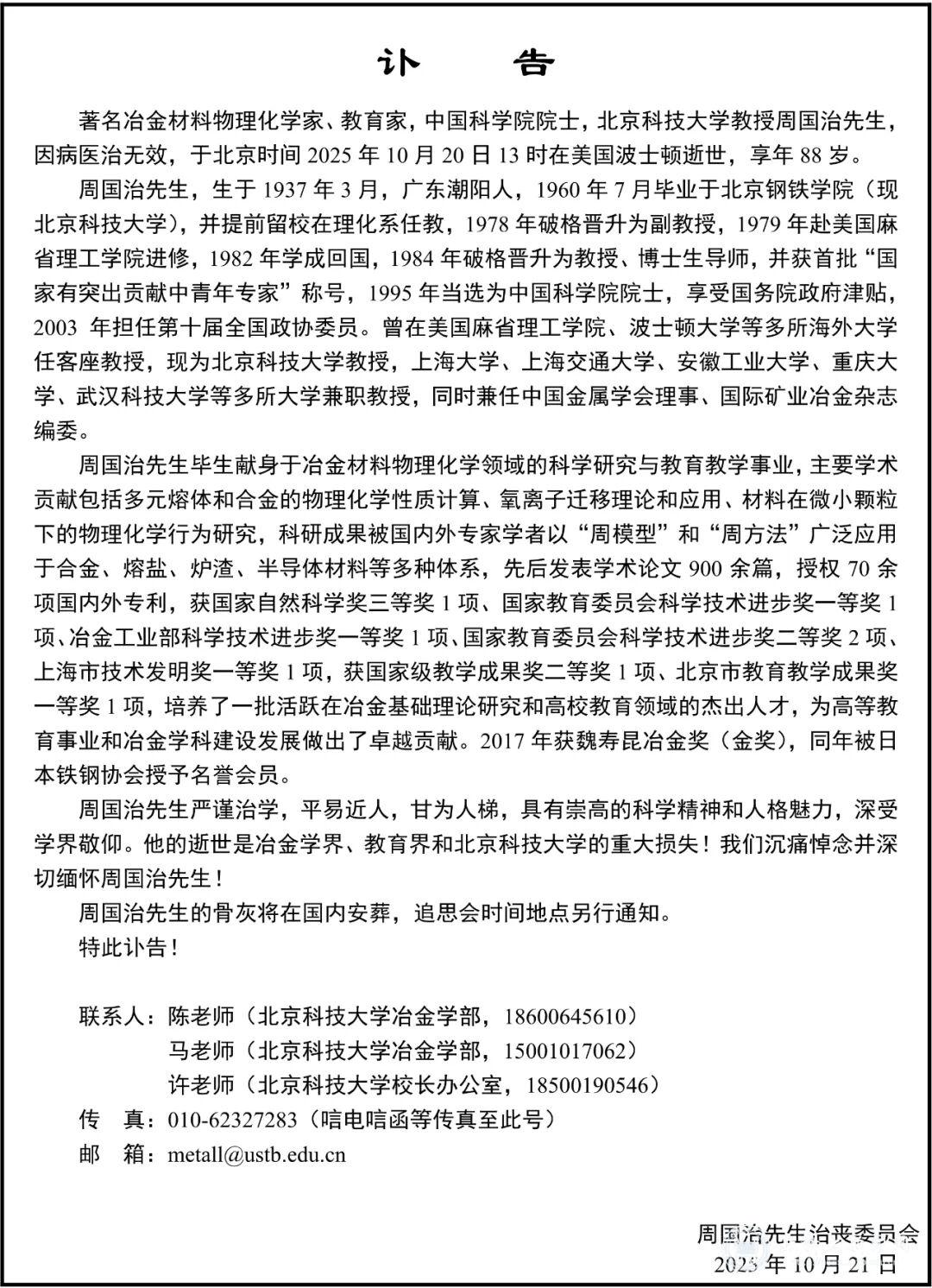 著名冶金材料物理化学家、教育家,中国科学院院士,北京科技大学教授周国治先生,因病医治无效,于北京时间2025年10月20日13时逝世,享年88岁。