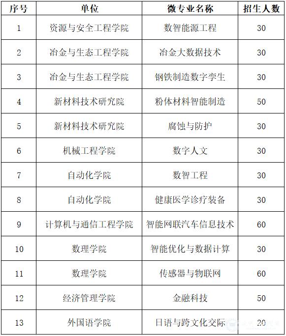 新京报讯(记者杨菲菲)近日,记者从北京科技大学获悉,为了纵深推进人才培养模式改革,探讨基于微专业的课程交叉融合方式,面向校内学生开设首批13个微专业、共招生480人。