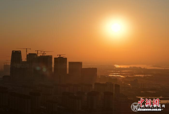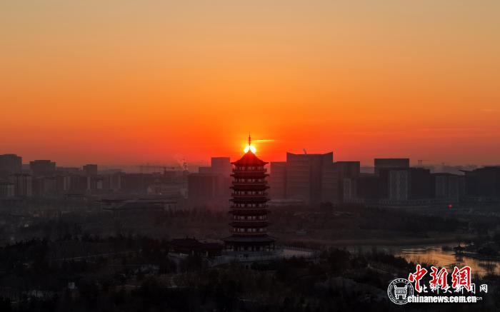 1月1日,航拍河北雄安新区容东片区悦容公园日出景色。(无人机照片)中新社发 胡忠 摄