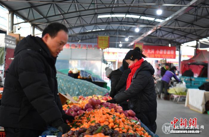 1月1日,河北雄安新区张市大集内市民正在挑选水果。中新社记者 韩冰 摄