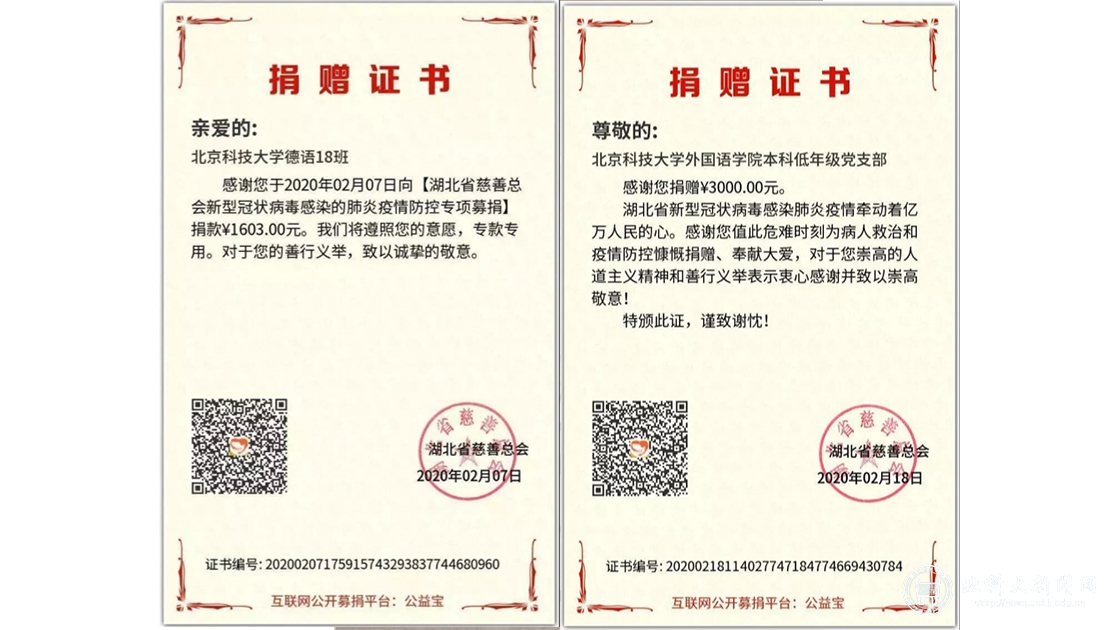 除了树立个人表率,外国语学院充分发挥基层党组织、团组织作用,倡导学生党员、团员在抗击疫情中有担当、做表率,积极贡献一份自己的力量,本科低年级党支部及德语18班在广泛征求学生意见的基础上,通过集体获奖捐款与个人自发捐款的形式,共计向湖北慈善总会捐款4603元,其中本科低年级党支部捐款3000元,德语18班捐款1603元。