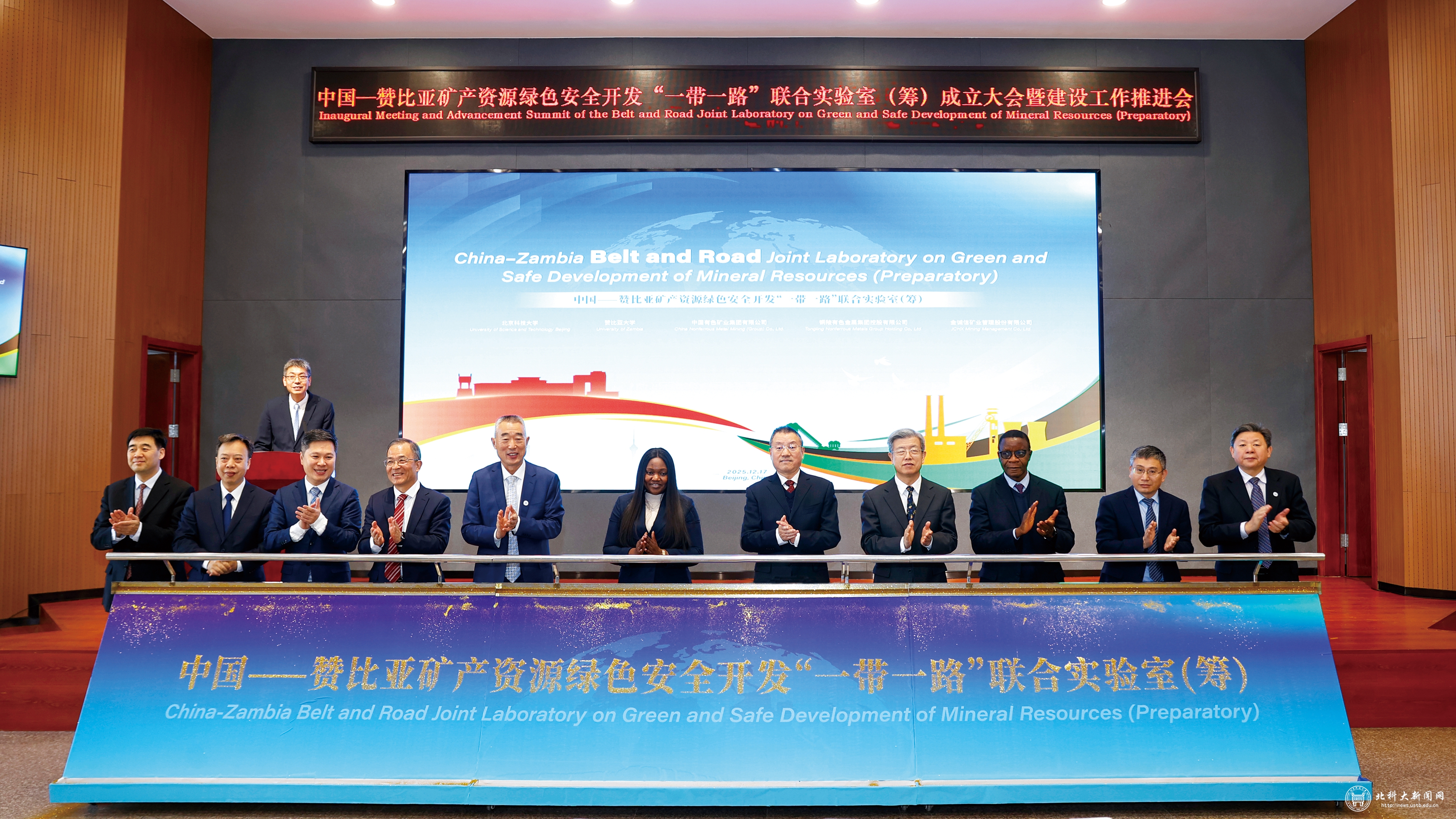 12月17日,中国—赞比亚“一带一路”联合实验室国家级科技创新平台建设工作推进会在学校举行。该实验室聚焦绿色矿产领域,是中赞两国首个“一带一路”联合实验室。赞比亚驻华大使馆大使代表娜玛卡朵,赞比亚大学校长蒙迪亚·穆亚,国家矿山安全监察局党组成员、副局长裴文田,中国有色矿业集团有限公司总经理张晋军,中国有色矿业集团有限公司副总经理范巍,铜陵有色金属集团股份有限公司党委书记、总经理文燕,金诚信矿业管理股份有限公司董事长王青海;学校党委书记武贵龙,校长杨仁树,中国工程院院士吴爱祥,副校长张卫冬,党委常委、宣传部部长尹兆华出席会议。会议由学校副校长焦树强主持。