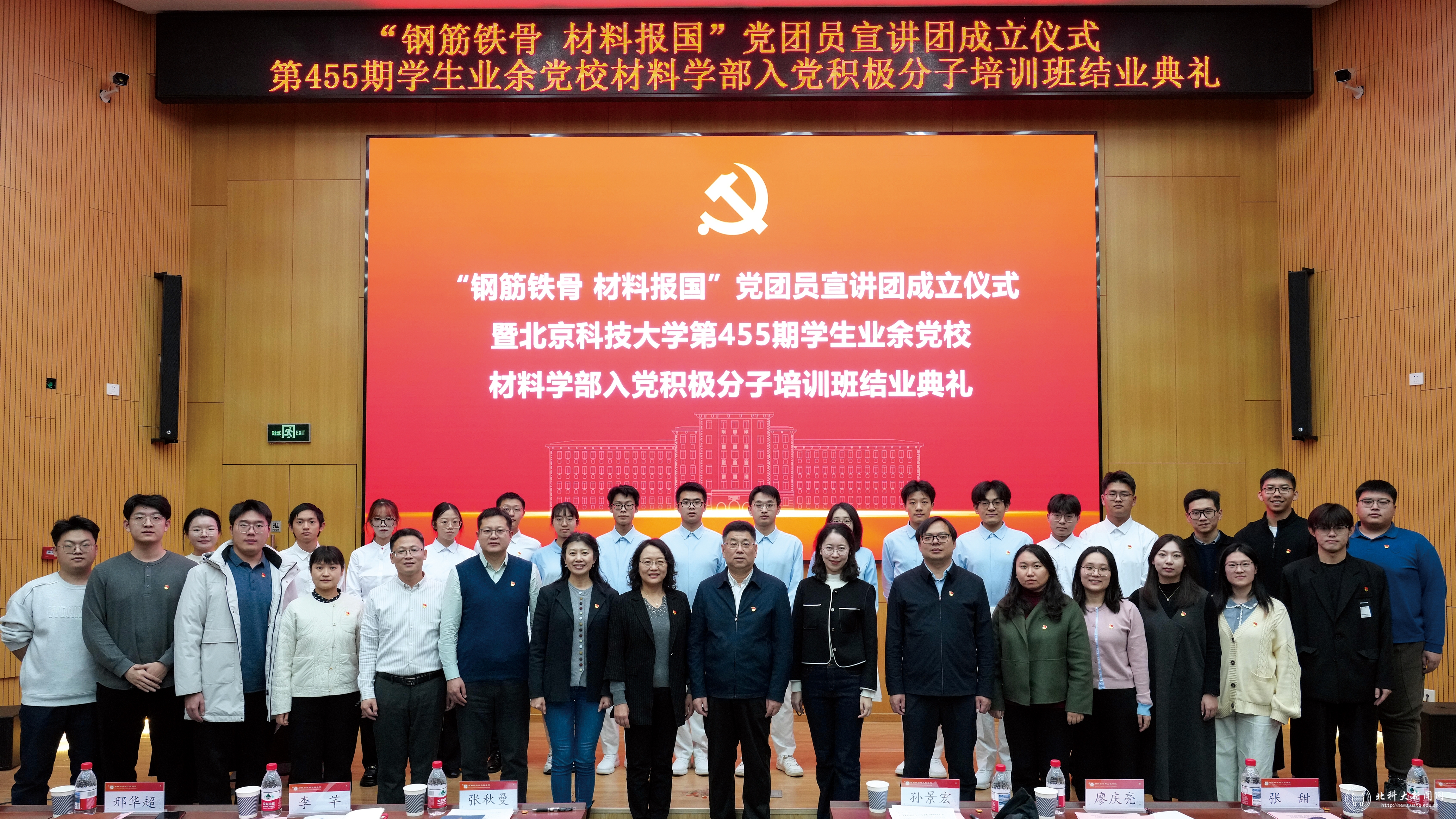 仪式上,材料学部副主任廖庆亮宣读宣讲团成立决定。材料科学与工程学院党委书记张秋曼将鲜红的团旗郑重授予宣讲团代表。新金属材料全国重点实验室党委书记张甜、新材料技术研究院党委书记李芊为首批宣讲团成员颁发聘书。张盼向成员们赠予《钢铁铸就时代精神》一书。