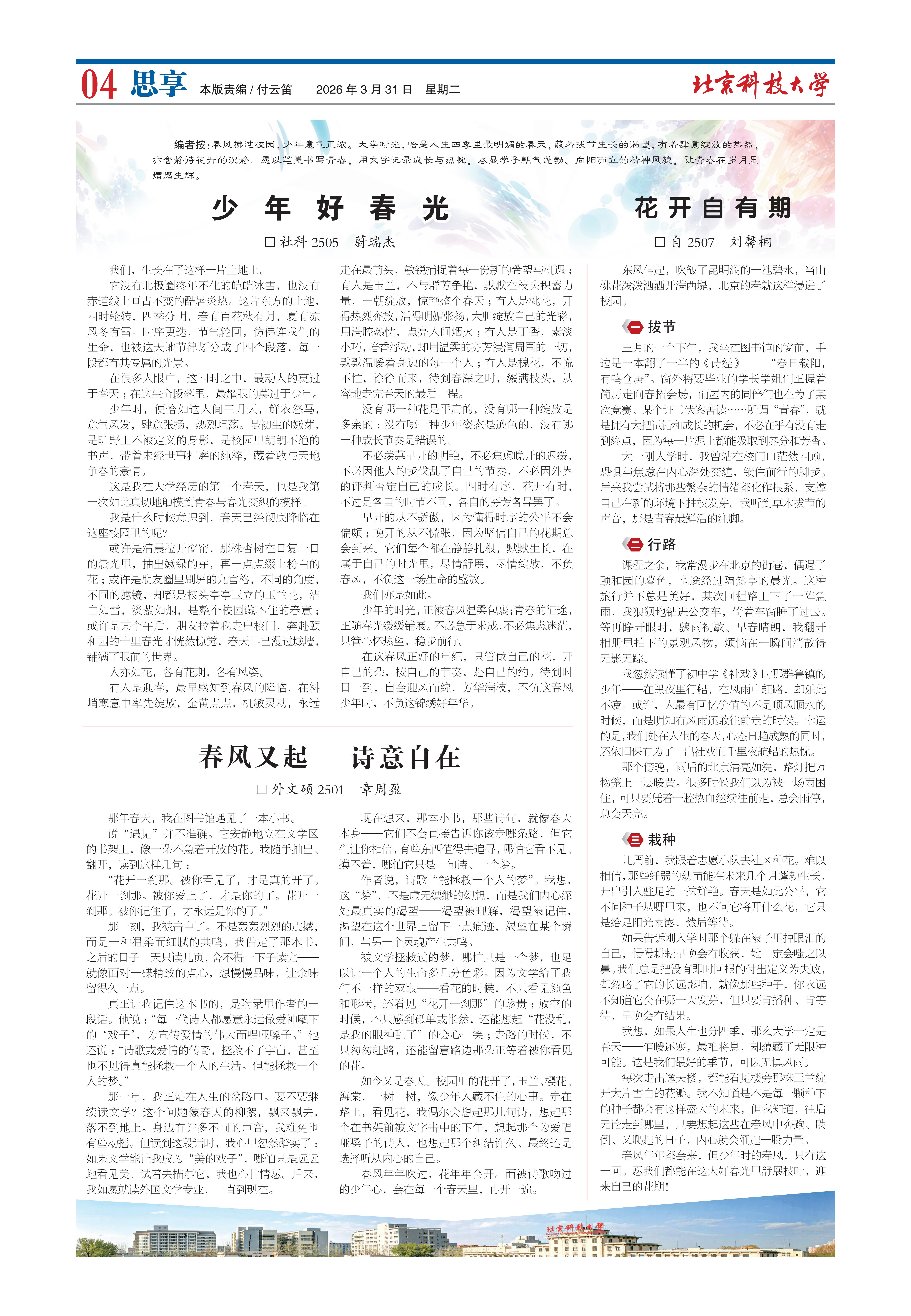 春风拂过校园,少年意气正浓。大学时光,恰是人生四季里最明媚的春天,藏着拔节生长的渴望,有着肆意绽放的热烈,亦含静待花开的沉静。愿以笔墨书写青春,用文字记录成长与热忱,尽显学子朝气蓬勃、向阳而立的精... -